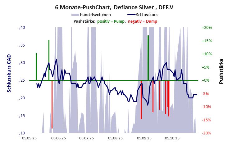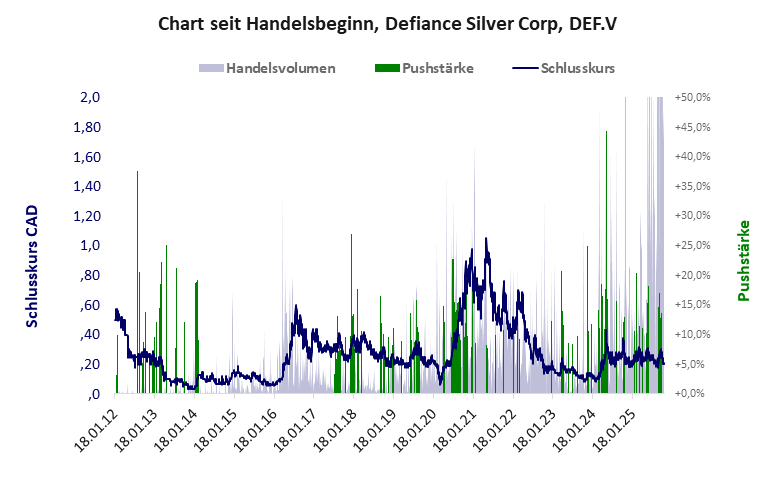 Bilanz besteht fast vollständig aus abgeschriebenen Explorationskosten, sonst gibt es nichts, außer Pushing. Defiance Silver hat ein schwaches Gesamtscoring und ist ein kleiner Pennystock mit einem starken Kursverlust. Das Gesamtvermögen ist beträchtlich, die Vermögenswerte scheinen nicht werthaltig zu sein, der Umsatz ist nicht existent, die Ertragslage extrem verlustreich, die Geldverbrennung erträglich.