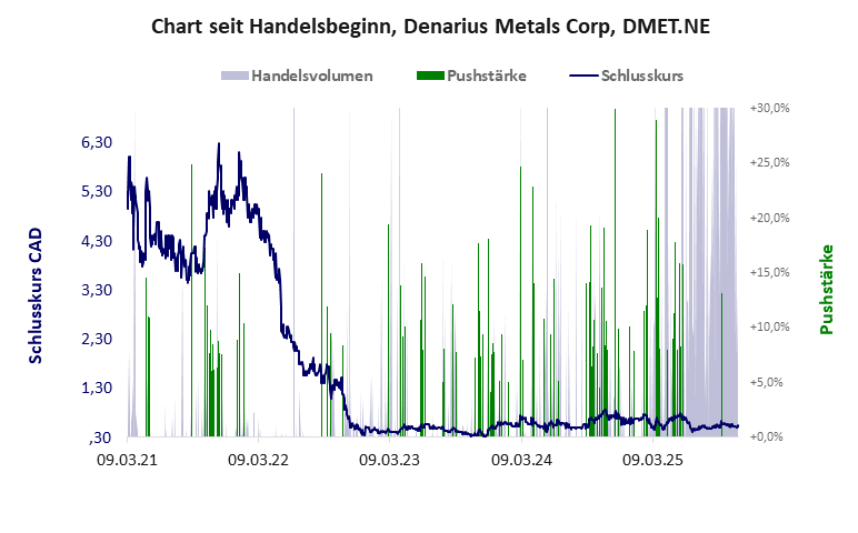 Denarius Metals hat ein kritisches Gesamtscoring und ist ein Pennystock mit einem riesigen Kursverlust. Das Gesamtvermögen ist beträchtlich, die Vermögenswerte scheinen nicht werthaltig zu sein, der Umsatz ist mickrig, die Ertragslage extrem verlustreich, die Geldverbrennung hoch.