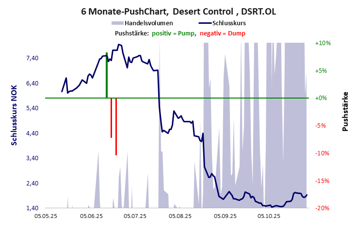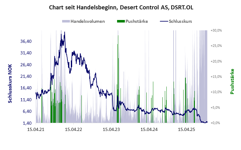 Ein kleiner Mittelständler mit Cash, sonst nichts. Kurspushing bleibt nach erstem Kursgewinn erfolglos. Der Kurs verfällt. Desert Control hat ein kritisches Gesamtscoring und ist eine billige Aktie mit einem riesigen Kursverlust. Das Gesamtvermögen ist beträchtlich, die Vermögenswerte scheinen wenig werthaltig zu sein, der Umsatz ist überschaubar, die Ertragslage extrem verlustreich, die Geldverbrennung ziemlich hoch.