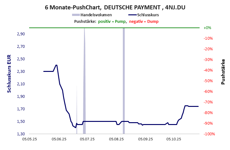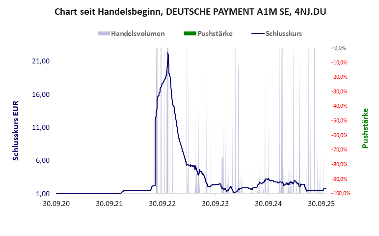 ein Habenichts als Firma mit undurchsichtigem Kurs und kaum Handel. Eine Pusheraktie der ungewöhnlichen Art. DEUTSCHE PAYMENT hat ein gutes Gesamtscoring und ist eine billige Aktie mit Kursgewinn. Das Gesamtvermögen ist karg, die Vermögenswerte scheinen nicht werthaltig zu sein, der Umsatz ist überschaubar, die Ertragslage extrem verlustreich, der Vermögensverlust extrem hoch.