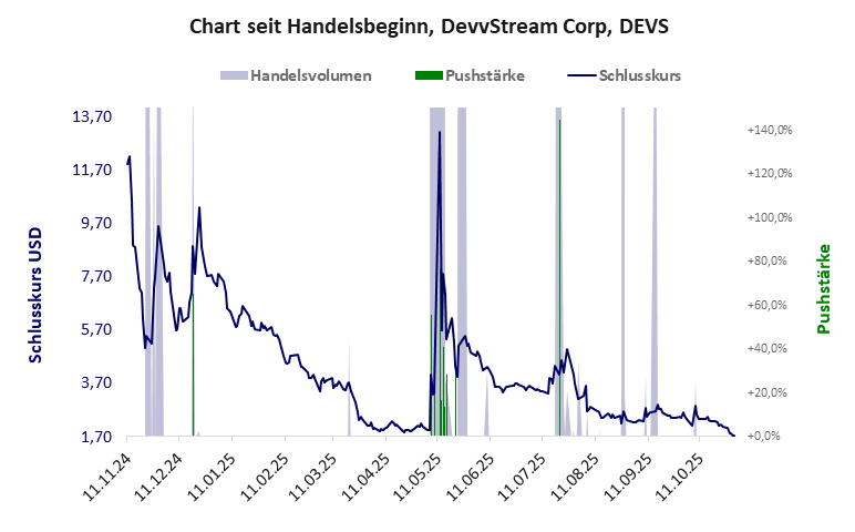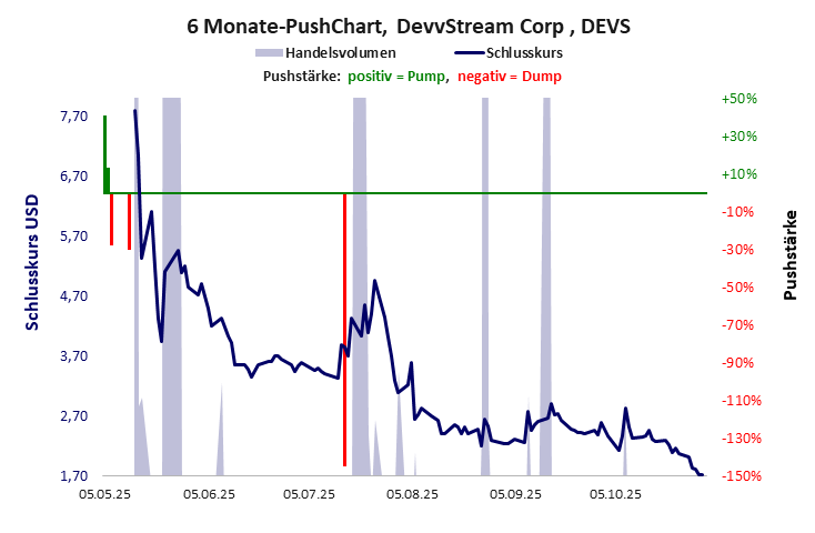 Der erste Pump and Dump des Habenichts war bereits gelaufen, als er am 27.05.25 an der FWB aufschlug, . DevvStream Corp hat ein inakzeptables Gesamtscoring und ist eine billige Aktie mit einem riesigen Kursverlust. Das Gesamtvermögen ist karg, die Vermögenswerte scheinen nicht vorhanden zu sein, der Umsatz ist mickrig, die Ertragslage extrem verlustreich, die Geldverbrennung extrem hoch.