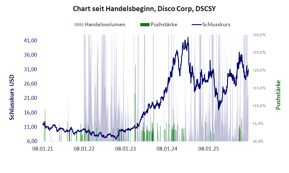 Disco Corp ist ein Konzern mit einer Standard-Aktie der Klasse I und den Eckdaten: