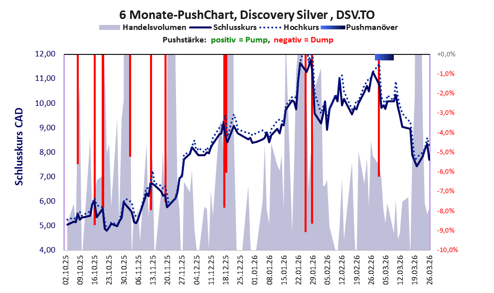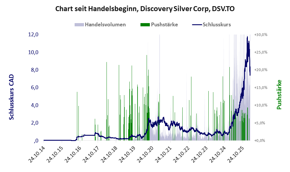 Über diese Aktie berichtet JS-Research. Das tägliche Handelsvolumen betrug an obiger Börse während der letzten drei Monate bis Berichtsdatum: 3.756.459 Stück, das sind 0,5% der ausgegebenen Aktien. Das von Discovery Silver verbrannte Geld könnte sich amortisieren.