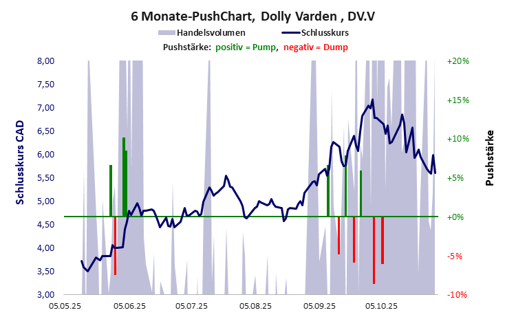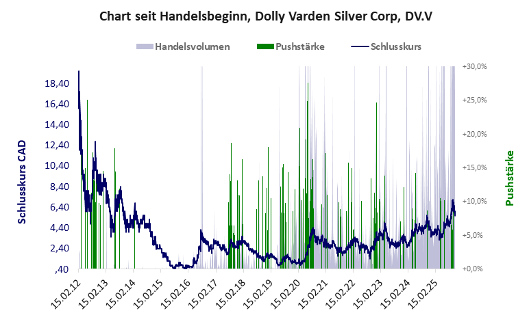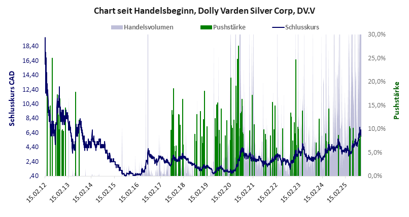 Bilanziert man nüchtern ohne die Blütenträume, auf den großen Silberschatz zu stoßen, dann bleiben nur die Tatsachen, dass die Finanzdaten schlecht sind und der Aktienkurs laufend gepusht wird. Welch soliden Anleger soll dieser Zustand dazu verlocken, diese Aktie zu kaufen? Das werden nur Zocker tun, die in den einschlägigen Foren aus persönlicher Überzeugung oder auf Geheiß nicht müde werden, Dolly Varden als den großen Wurf auszuloben, wenn man nur ein bisschen Geduld und Zuversicht habe. Und das seit gut einem Jahrzehnt? Dolly Varden hat ein akzeptables Gesamtscoring und ist eine günstige Aktie mit einem riesigen Kursverlust. Das Gesamtvermögen ist groß, die Vermögenswerte scheinen sehr werthaltig zu sein, der Umsatz ist nicht existent, die Ertragslage extrem verlustreich, die Geldverbrennung hoch.