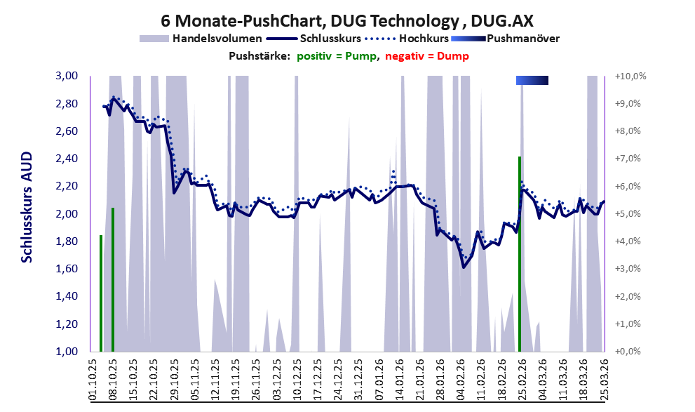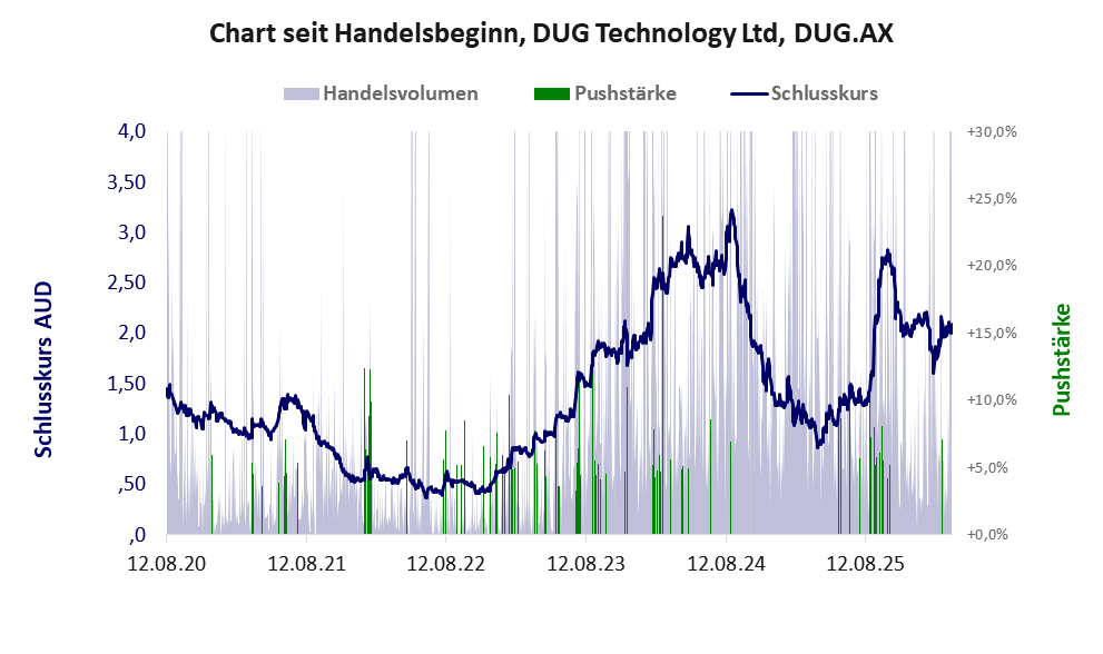 Das tägliche Handelsvolumen betrug an obiger Börse während der letzten drei Monate bis Berichtsdatum: 220.886 Stück, das sind 0,2% der ausgegebenen Aktien. Bei DUG Technology rechtfertigt das schwache operative Geschäft nicht die Geldverbrennung.