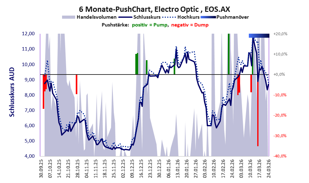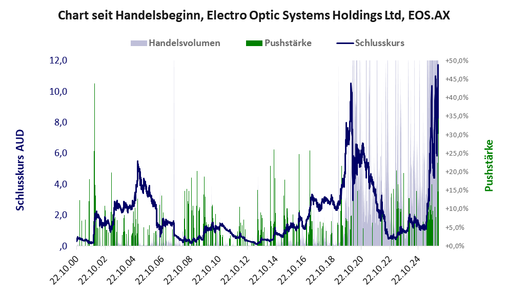 Das tägliche Handelsvolumen betrug an obiger Börse während der letzten drei Monate bis Berichtsdatum: 4.133.746 Stück, das sind 2,1% der ausgegebenen Aktien. Die hohe Geldverbrennung in der Investitionsphase von Electro Optic hat sich gelohnt. Die Produktion wurde aufgenommen, ist aber noch unprofitabel.
