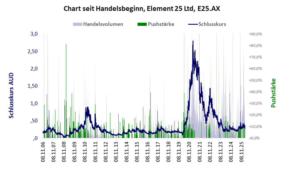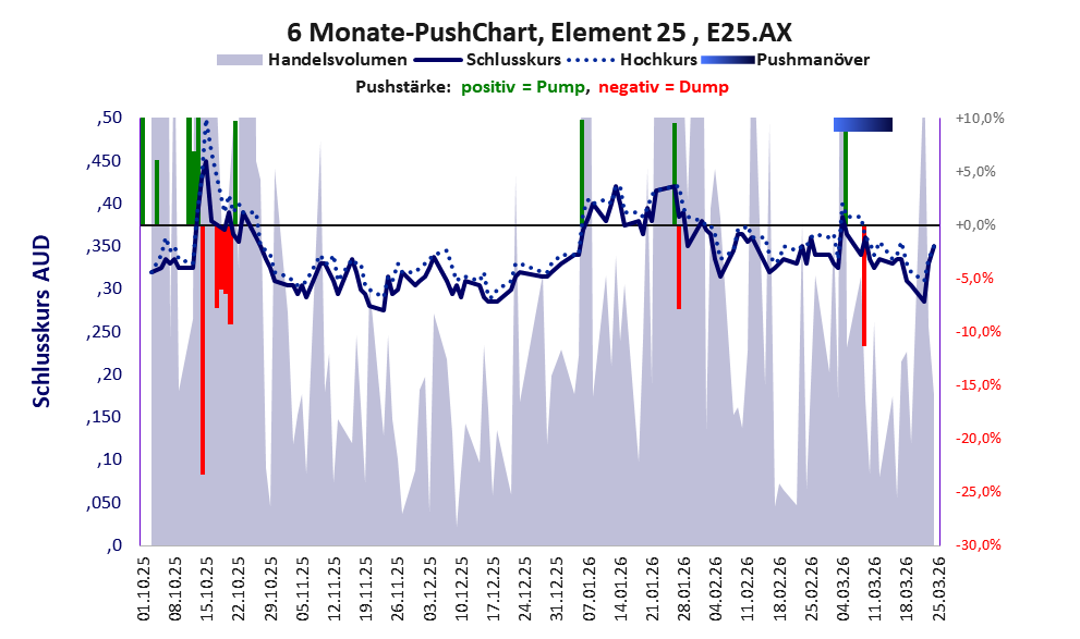 Über diese Aktie berichtet w:o. Das tägliche Handelsvolumen betrug an obiger Börse während der letzten drei Monate bis Berichtsdatum: 413.716 Stück, das sind 0,2% der ausgegebenen Aktien. Bei Element 25 fehlt ein operatives Geschäft, stattdessen wird das Geld der Investoren verbrannt.