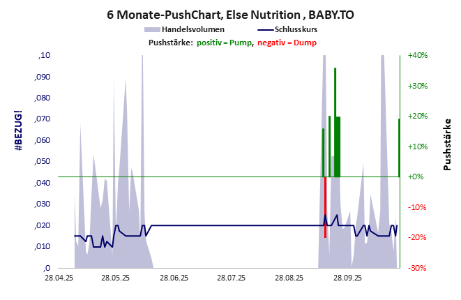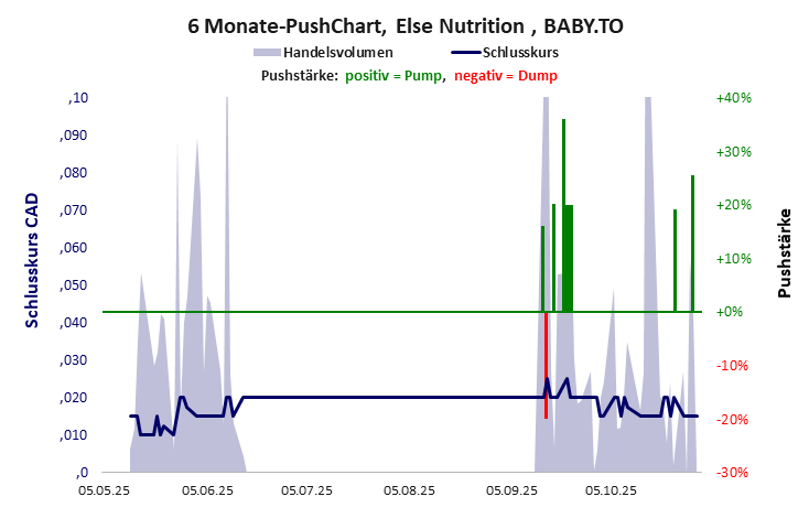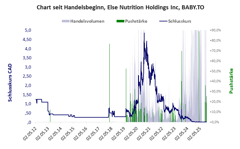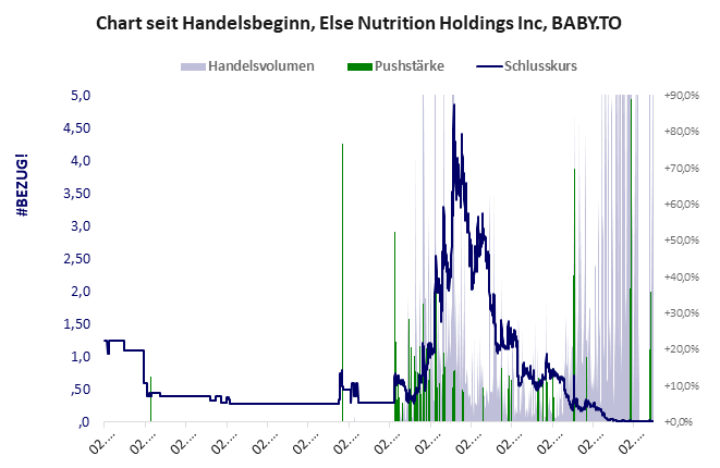 die Aktie ist keine Erwähnung mehr wert. Aber ihre Eigenschaften sind so typisch für Pusheraktien, dass sich ein Blick lohnt. Wenn eine israelische Firma in Kanada an die Börse geht, wenn der Kursverlauf solch solitäre Spitze besitzt, wenn der Kurs am Ende fast nicht mehr zum Pennystock taugt, wenn die Finanzlage so mies ist, dann gibt es, selbst wenn Medienwerbung fehlt, keinen Zweifeles ist eine Pusheraktie (gewesen), die in den Müll gehört. Nach aktuellem Kurs und Handelsvolumen besteht anscheinend nur noch automatisierter Handel. Else Nutrition hat ein sehr schlechtes Gesamtscoring und ist ein mickriger Pennystock mit praktisch einem Totalverlust. Das Gesamtvermögen ist überschaubar, die Vermögenswerte scheinen nicht werthaltig zu sein, der Umsatz ist überschaubar, die Ertragslage extrem verlustreich, die Geldverbrennung extrem hoch.