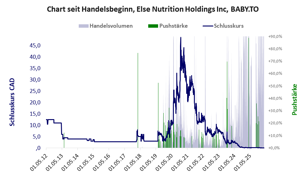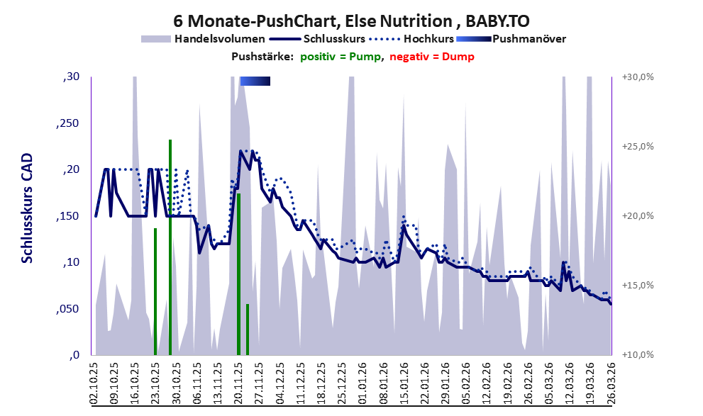 Bei dieser Aktie, über die w:o berichtet, gibt es 2 Pump & Dump-Manöver. Das tägliche Handelsvolumen betrug an obiger Börse während der letzten drei Monate bis Berichtsdatum: 109.930 Stück, das sind 0,3% der ausgegebenen Aktien. Bei Else Nutrition rechtfertigt das schwache operative Geschäft nicht die Geldverbrennung.