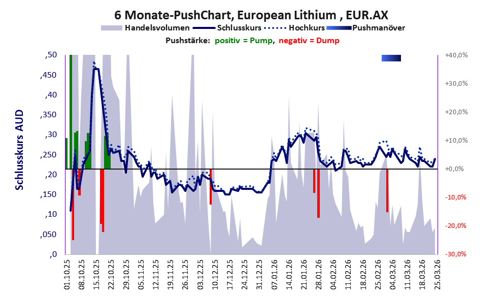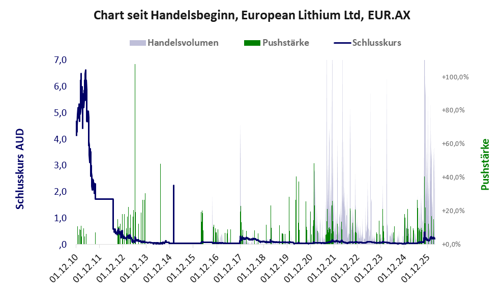 Bei dieser Aktie, über die Apaton berichtet, liegt das Refreshmodell und das Inkassomodell vor und es gibt 1 Pump & Dump-Manöver. Das tägliche Handelsvolumen betrug an obiger Börse während der letzten drei Monate bis Berichtsdatum: 10.435.911 Stück, das sind 0,6% der ausgegebenen Aktien. Bei European Lithium fehlt ein operativer Geschäftserfolg, stattdessen wird das Geld der Investoren im großen Stil verbrannt.