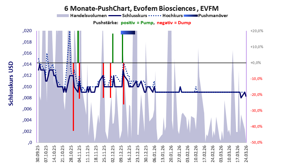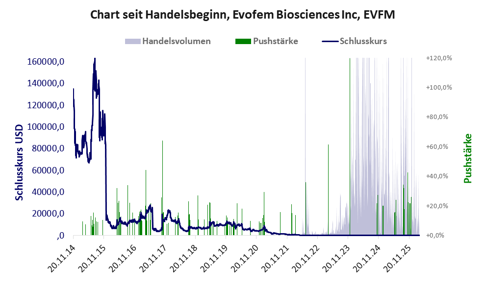 Bei dieser Aktie liegt das Inkassomodell vor. Das tägliche Handelsvolumen betrug an obiger Börse während der letzten drei Monate bis Berichtsdatum: 187.540 Stück, das sind 0,1% der ausgegebenen Aktien. Bei Evofem Biosciences wird bei schwachen operativen Geschäft zu viel Geld verbrannt.