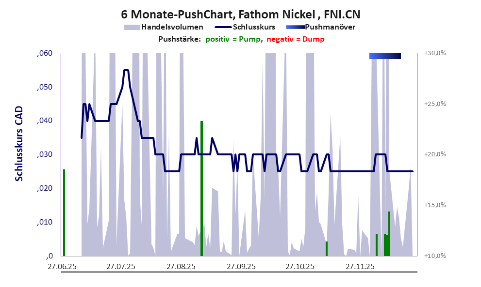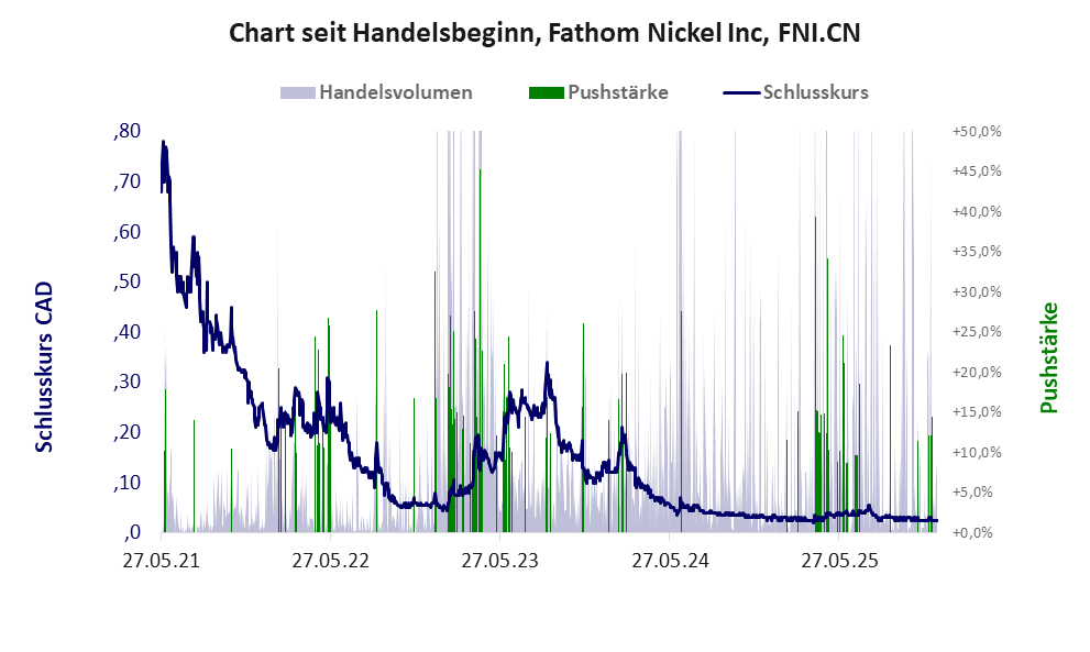 Bei dieser Aktie liegt das „Inkassomodell“ vor, bei dem der Aktienkurs zu Beginn der Geschichte sein Allzeithoch hat. Die Akteure verkaufen schon zu Beginn nach und nach ihre billigst erworbenen Aktien, so dass der Kurs in verhältnismäßig kurzer Zeit abstürzt. Danach dümpelt der Aktienkurs in den meistn Fällen nahe null dahin und die Aktie dient nur noch kleineren, dennoch gewinnbringenden Pushmanövern und in vielen Fällen dem Algotrading. Dem ersten Einbruch nachfolgende größere Pushmanöver sind aber nicht ausgeschlossen.