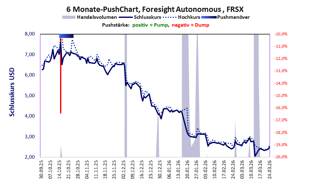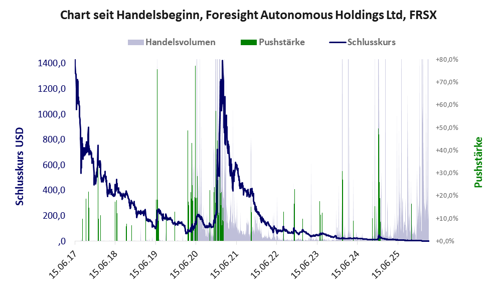 Das tägliche Handelsvolumen betrug an obiger Börse während der letzten drei Monate bis Berichtsdatum: 259.271 Stück, das sind 17,8% der ausgegebenen Aktien. Bei Foresight Autonomous wird bei schwachen operativen Geschäft zu viel Geld verbrannt.