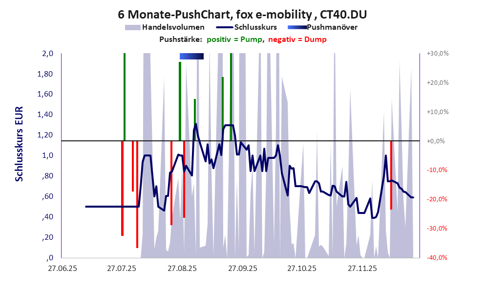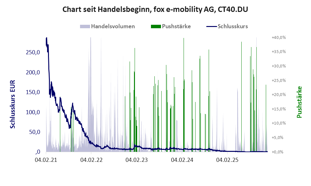 Bei dieser Aktie liegt das „Inkassomodell“ vor, bei dem der Aktienkurs zu Beginn der Geschichte sein Allzeithoch hat. Die Akteure verkaufen schon zu Beginn nach und nach ihre billigst erworbenen Aktien, so dass der Kurs in verhältnismäßig kurzer Zeit abstürzt. Danach dümpelt der Aktienkurs in den meistn Fällen nahe null dahin und die Aktie dient nur noch kleineren, dennoch gewinnbringenden Pushmanövern und in vielen Fällen dem Algotrading. Dem ersten Einbruch nachfolgende größere Pushmanöver sind aber nicht ausgeschlossen.