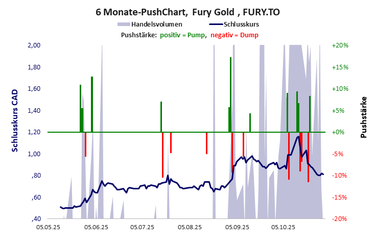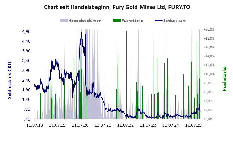 aus dem großen Besitz von Bergbaubeteiligungen entspringt bisher kein Erfolg, so dass der mehrfach gepushte Kurs seit Jahren unter 1 CAD liegt. Die Fury Gold hat ein schwaches Gesamtscoring und ist ein Pennystock mit einem riesigen Kursverlust. Das Gesamtvermögen ist beträchtlich, die Vermögenswerte scheinen werthaltig zu sein, der Umsatz ist nicht existent, die Ertragslage extrem verlustreich, die Geldverbrennung extrem hoch.
