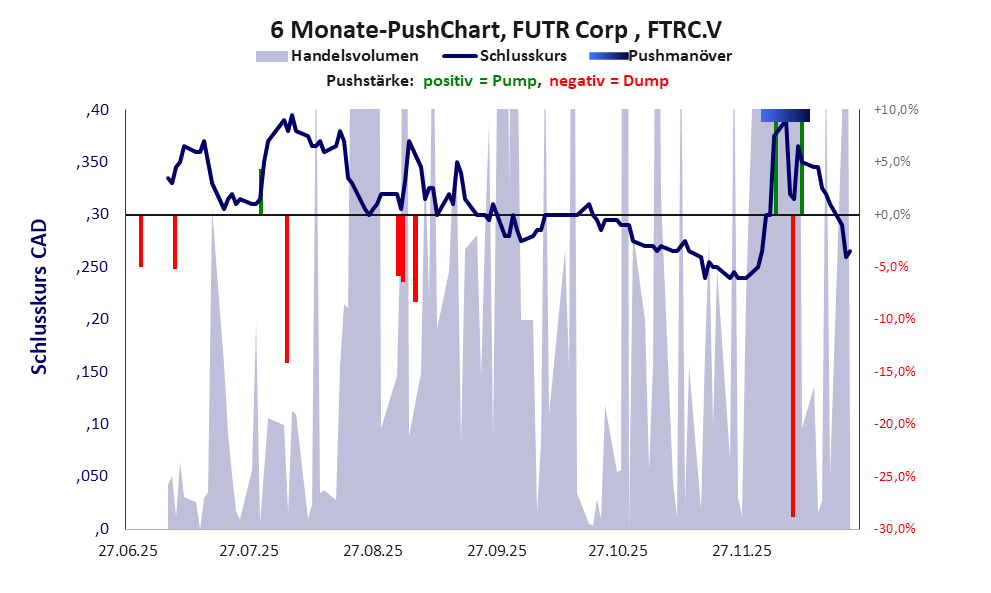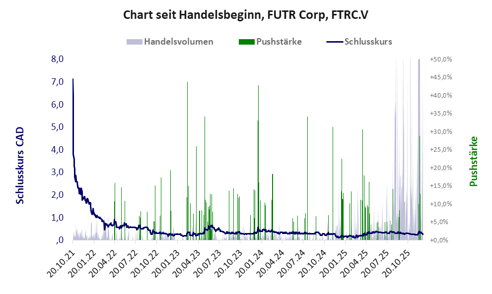 Bei dieser Aktie liegt das „Inkassomodell“ vor, bei dem der Aktienkurs zu Beginn der Geschichte sein Allzeithoch hat. Die Akteure verkaufen schon zu Beginn nach und nach ihre billigst erworbenen Aktien, so dass der Kurs in verhältnismäßig kurzer Zeit abstürzt. Danach dümpelt der Aktienkurs in den meistn Fällen nahe null dahin und die Aktie dient nur noch kleineren, dennoch gewinnbringenden Pushmanövern und in vielen Fällen dem Algotrading. Dem ersten Einbruch nachfolgende größere Pushmanöver sind aber nicht ausgeschlossen.