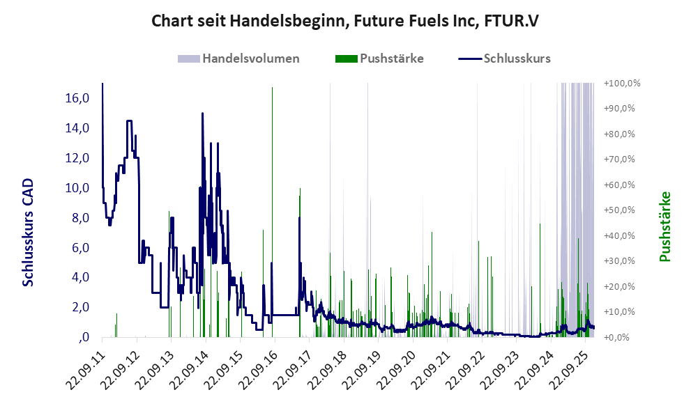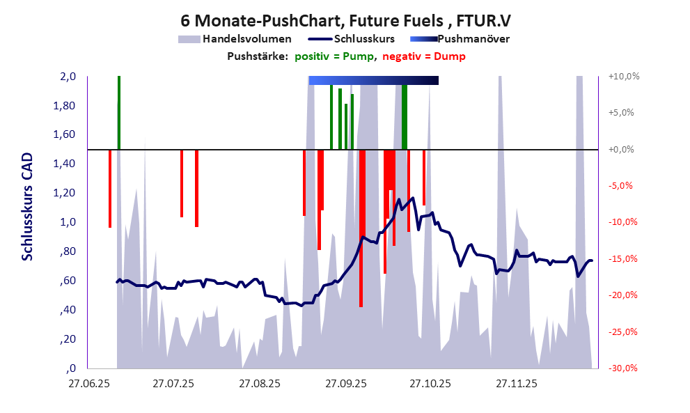 Bei dieser Aktie liegt das „Inkassomodell“ vor, bei dem der Aktienkurs zu Beginn der Geschichte sein Allzeithoch hat. Die Akteure verkaufen schon zu Beginn nach und nach ihre billigst erworbenen Aktien, so dass der Kurs in verhältnismäßig kurzer Zeit abstürzt. Danach dümpelt der Aktienkurs in den meistn Fällen nahe null dahin und die Aktie dient nur noch kleineren, dennoch gewinnbringenden Pushmanövern und in vielen Fällen dem Algotrading. Dem ersten Einbruch nachfolgende größere Pushmanöver sind aber nicht ausgeschlossen.