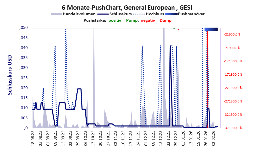 Die Bewertung dieser Aktie ist wegen fehlender Daten nicht vollständig oder vorliegende Daten sind falsch. Bei dieser Aktie, über die w:o berichtet, liegt das Inkassomodell vor und es gibt 81 Pump & Dump-Manöver. Das tägliche Handelsvolumen betrug an obiger Börse während der letzten drei Monate bis Berichtsdatum: 2.078 Stück, das sind 0,0% der ausgegebenen Aktien.
