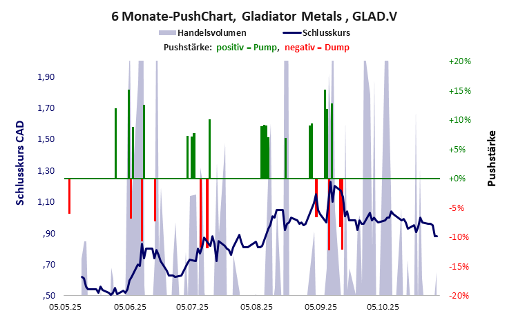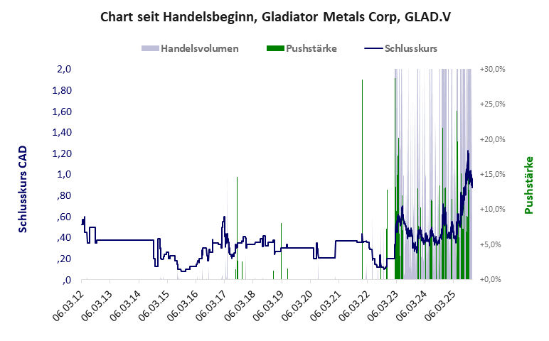 eine wertlose Firma, die außer etwas Geld in der Kasse, nichts zu bieten hat, außer etliche Pushmanöver erfahrener Akteure. Gladiator Metals hat ein schwaches Gesamtscoring und ist ein Pennystock mit Kursgewinn. Das Gesamtvermögen ist überschaubar, die Vermögenswerte scheinen nicht werthaltig zu sein, der Umsatz ist nicht existent, die Ertragslage extrem verlustreich, die Geldverbrennung ziemlich hoch.
