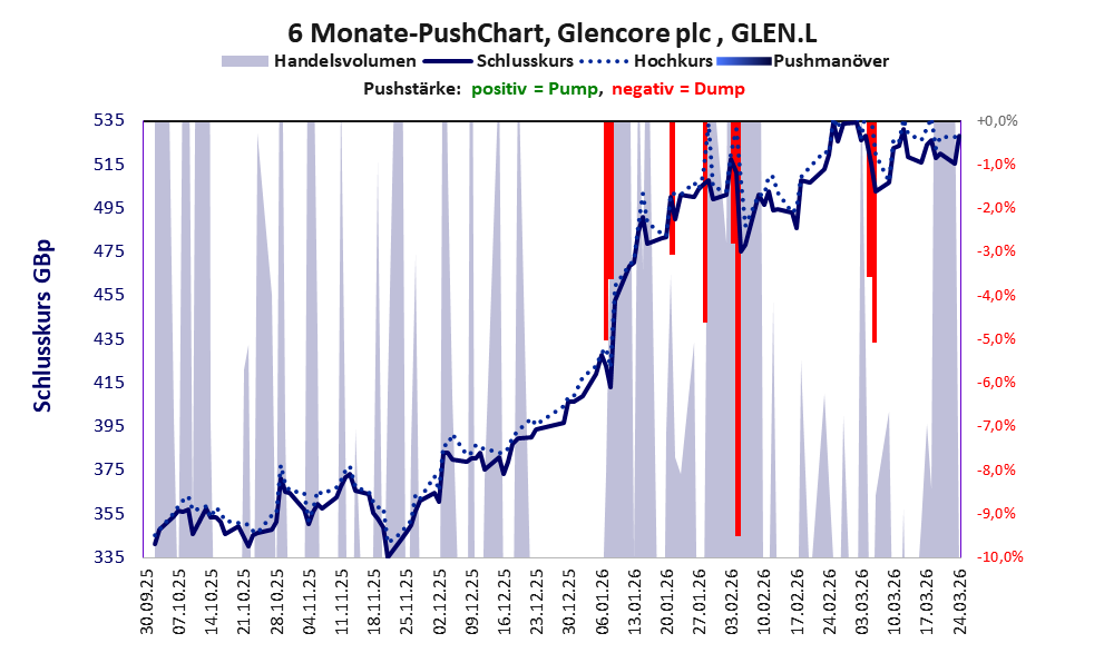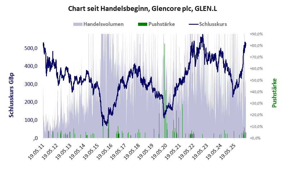 Das tägliche Handelsvolumen betrug an obiger Börse während der letzten drei Monate bis Berichtsdatum: 45.679.140 Stück, das sind 0,4% der ausgegebenen Aktien. Bei Glencore plc liegt ein profitabler Geschäftsbetrieb vor.