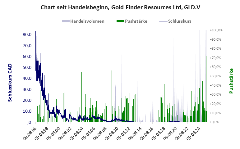 Gold Finder hat ein sehr schlechtes Gesamtscoring und ist ein mickriger Pennystock mit praktisch einem Totalverlust. Das Gesamtvermögen ist karg, die Vermögenswerte scheinen wenig werthaltig zu sein, der Umsatz ist nicht existent, die Ertragslage extrem verlustreich, die Geldverbrennung extrem hoch.