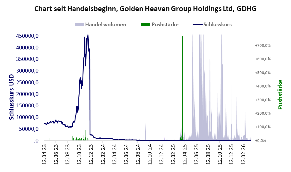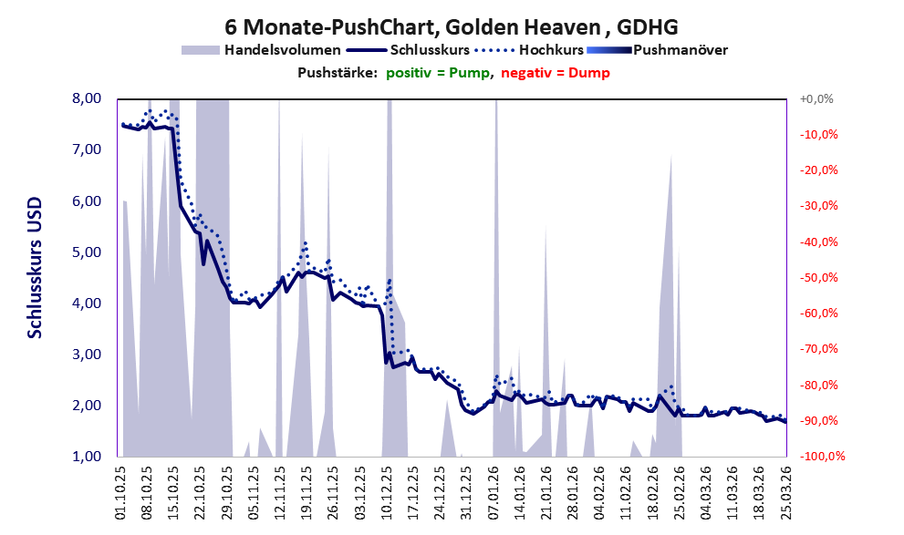 Bei dieser Aktie, über die w:o berichtet, gibt es 3 Pump & Dump-Manöver. Das tägliche Handelsvolumen betrug an obiger Börse während der letzten drei Monate bis Berichtsdatum: 7.970 Stück, das sind 0,0% der ausgegebenen Aktien. Das operative Geschäft von Golden Heaven wirft keinen Profit ab.