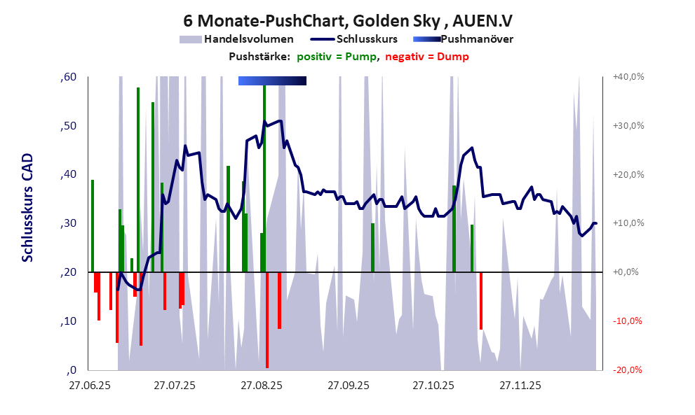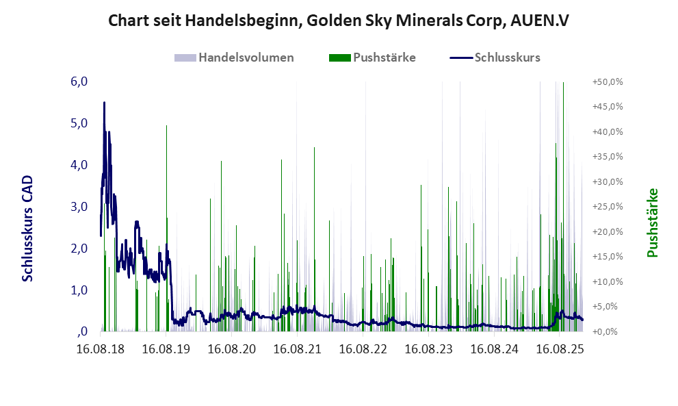 Bei dieser Aktie liegt das „Inkassomodell“ vor, bei dem der Aktienkurs zu Beginn der Geschichte sein Allzeithoch hat. Die Akteure verkaufen schon zu Beginn nach und nach ihre billigst erworbenen Aktien, so dass der Kurs in verhältnismäßig kurzer Zeit abstürzt. Danach dümpelt der Aktienkurs in den meistn Fällen nahe null dahin und die Aktie dient nur noch kleineren, dennoch gewinnbringenden Pushmanövern und in vielen Fällen dem Algotrading. Dem ersten Einbruch nachfolgende größere Pushmanöver sind aber nicht ausgeschlossen.