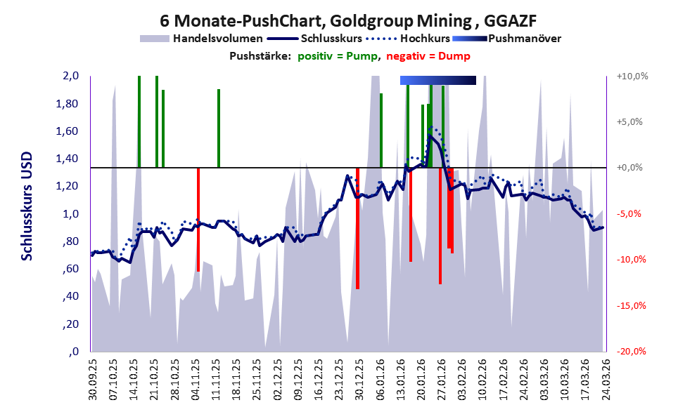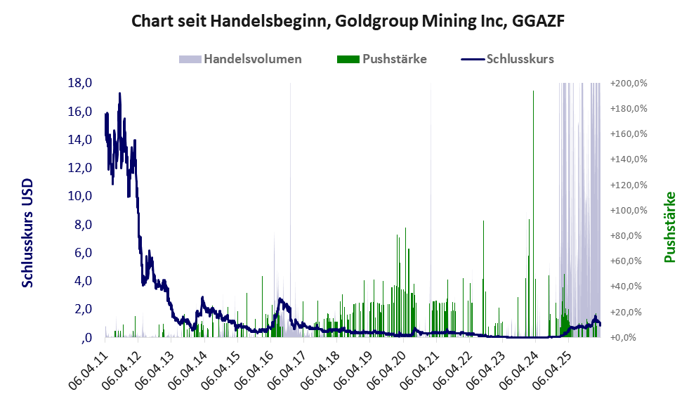 Bei dieser Aktie, über die Machai berichtet, liegt das Inkassomodell vor und es gibt 2 Pump & Dump-Manöver. Das tägliche Handelsvolumen betrug an obiger Börse während der letzten drei Monate bis Berichtsdatum: 375.705 Stück, das sind 0,1% der ausgegebenen Aktien. Bei Goldgroup Mining wird bei schwachen operativen Geschäft zu viel Geld verbrannt.