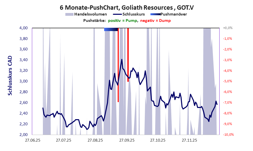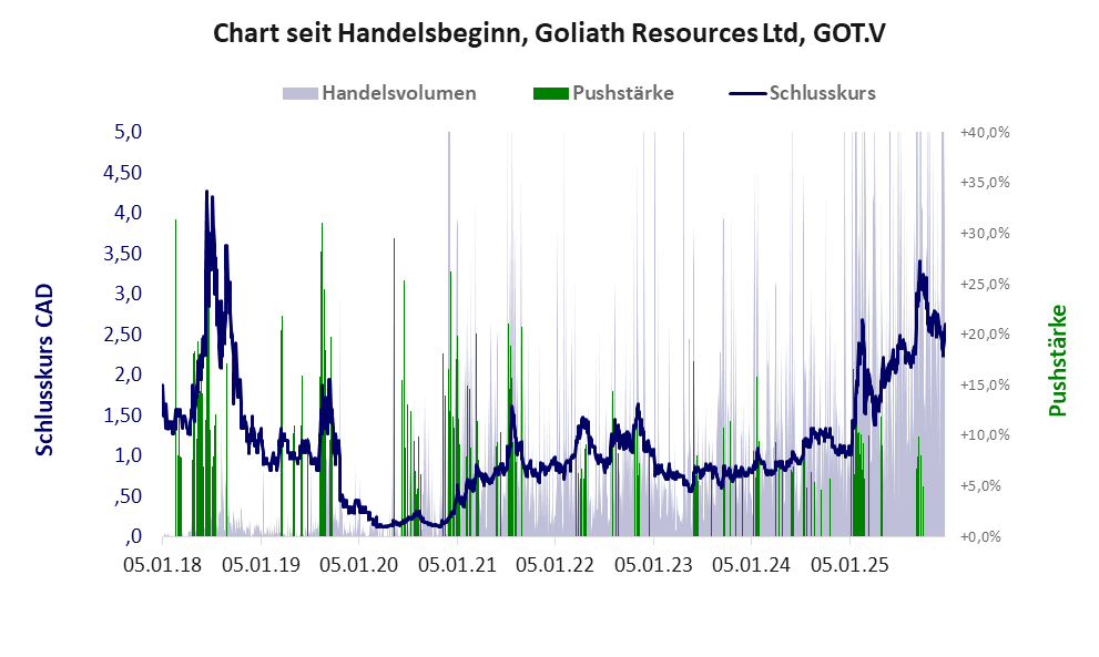 Die starke mediale Beachtung ist Show, denn das „Unternehmen“ besitzt keine Explorationsassets und die Claims sind laut Bilanz wertlos (nicht aktiviert). Zum Berichtszeitpunkt bestand das Vermögen des „Goliath“ aus knapp 8 Mio. CAD Cash und Aktien an der McEwen Mining von knapp 10 Mio. CAD. Das Equipment belief sich hingegen auf lausige 32.000 CAD. Das oder die Bohrprogramme werden demzufolge durch Dritte ausgeführt und mit dem Geld der Anleger aus den Private Placements bezahlt. Fundamental ist der Goliath ein Zwerglein mit der üblichen 1:4000 Chance auf den lucky punch. Der Kursanstieg ist somit nicht nachvollziehbar und nur erklärlich durch die laufenden Pushings. Dieser Aktie liegt das „Refreshmodell“ zu Grunde. Eine Durchsicht aller Geschäftsberichte würde recht sicher zeigen, dass das Unternehmen nie Umsatz und Profit erzielte und die gesamten Explorationskosten unter „Aktiva“ verbuchte. Das heißt, während aller Jahre wurde nichts gefunden, sondern die Investorengelder wurden für erfolglose Explorationsarbeiten verbrannt. Die bescheidene Exploration dient lediglich als Grundlage zur medialen Vermarktung von Erfolgsaussichten, auf eine große Lagerstätte zu stoßen, um damit das nächste Pushmanöver zu befeuern.