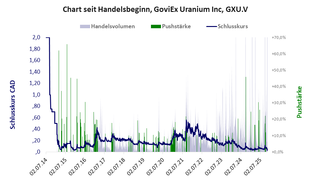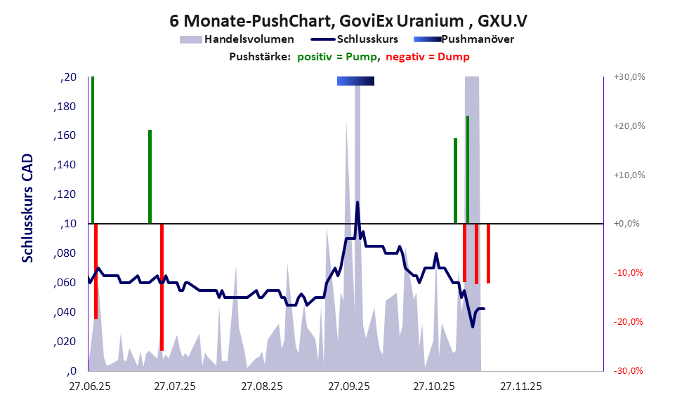 Dieser Aktie liegt das „Refreshmodell“ zu Grunde. Eine Durchsicht aller Geschäftsberichte würde recht sicher zeigen, dass das Unternehmen nie Umsatz und Profit erzielte und die gesamten Explorationskosten unter „Aktiva“ verbuchte. Das heißt, während aller Jahre wurde nichts gefunden, sondern die Investorengelder wurden für erfolglose Explorationsarbeiten verbrannt. Die bescheidene Exploration dient lediglich als Grundlage zur medialen Vermarktung von Erfolgsaussichten, auf eine große Lagerstätte zu stoßen, um damit das nächste Pushmanöver zu befeuern. Bei dieser Aktie liegt das „Inkassomodell“ vor, bei dem der Aktienkurs zu Beginn der Geschichte sein Allzeithoch hat. Die Akteure verkaufen schon zu Beginn nach und nach ihre billigst erworbenen Aktien, so dass der Kurs in verhältnismäßig kurzer Zeit abstürzt. Danach dümpelt der Aktienkurs in den meistn Fällen nahe null dahin und die Aktie dient nur noch kleineren, dennoch gewinnbringenden Pushmanövern und in vielen Fällen dem Algotrading. Dem ersten Einbruch nachfolgende größere Pushmanöver sind aber nicht ausgeschlossen.