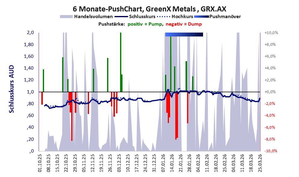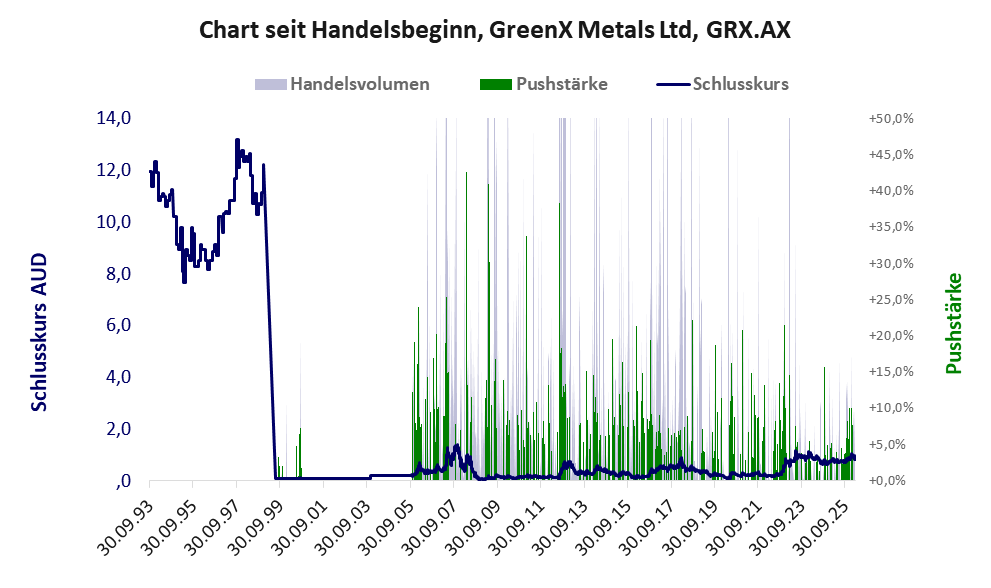 Über diese Aktie berichtet w:o. Das tägliche Handelsvolumen betrug an obiger Börse während der letzten drei Monate bis Berichtsdatum: 104.637 Stück, das sind 0,0% der ausgegebenen Aktien. Bei GreenX Metals rechtfertigt das schwache operative Geschäft nicht die Geldverbrennung.