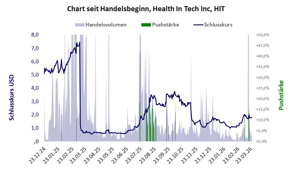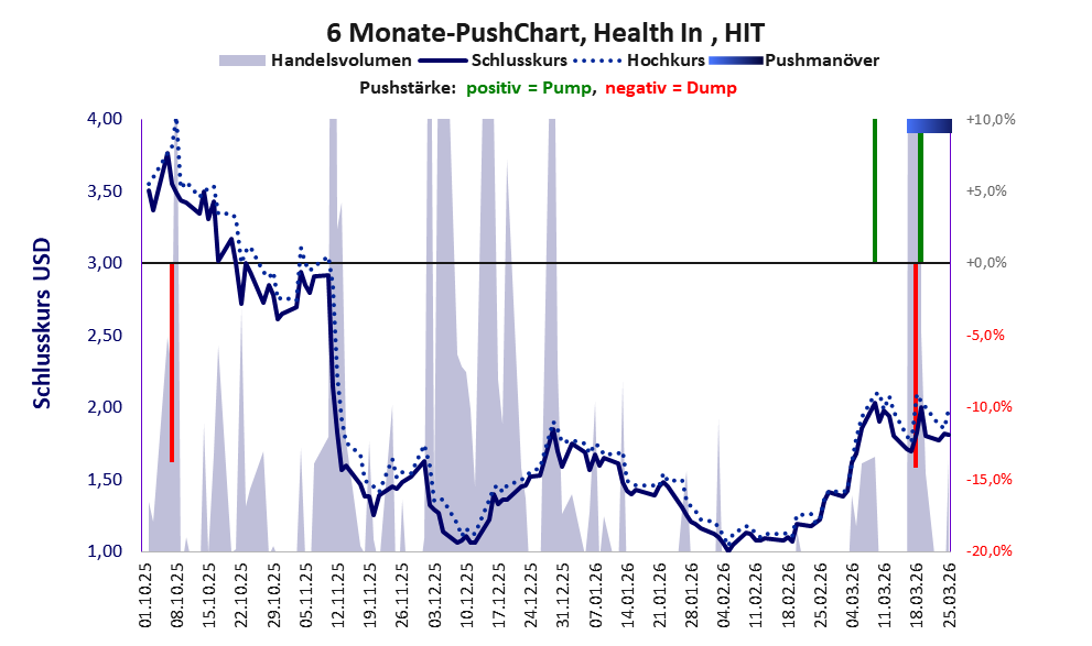 Über diese Aktie berichtet w:o. Das tägliche Handelsvolumen betrug an obiger Börse während der letzten drei Monate bis Berichtsdatum: 374.973 Stück, das sind 0,8% der ausgegebenen Aktien. Bei Health In liegt ein profitabler Geschäftsbetrieb vor.