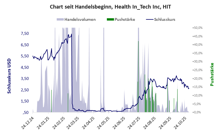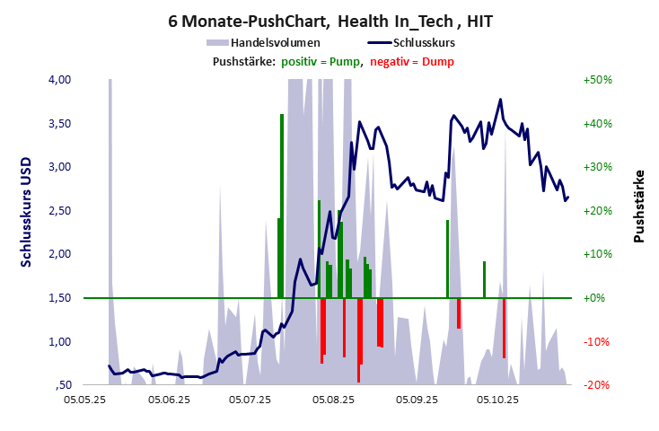 Der große Dump vom Frühjahr 2025 ist kaum vorbei und schon ist man wieder dabei, die Taschen der Anleger zu leeren. Seit Anfang Juli 2025 wurde kontinueirliche Kurspflege betrieben, die den Aktienkurs um 500% steigen ließ. Während beim letzten Mal ein scharfer Dump erfolgte, wird diesmal vorsichtig „gemolken“, um den Kurs nicht evident einbrechen zu lassen, sondern die Anleger bei der Stange zu halten. Health In_Tech hat ein schwaches Gesamtscoring und ist eine billige Aktie mit einem starken Kursverlust. Das Gesamtvermögen ist überschaubar, die Vermögenswerte scheinen nicht werthaltig zu sein, der Umsatz ist beträchtlich, die Ertragslage mäßig, die Geldverbrennung gering.