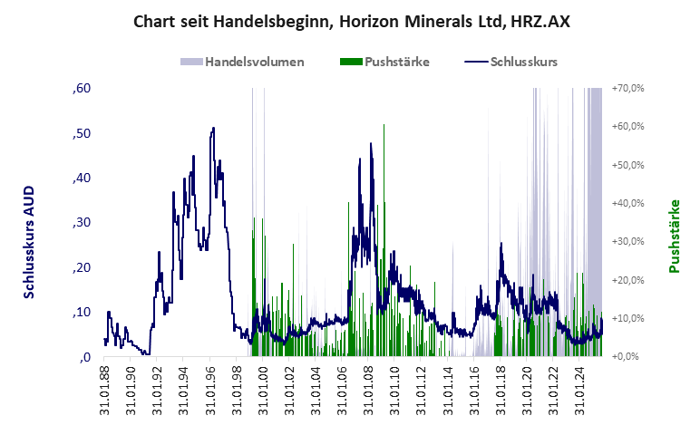 Die Pushstärke ist ein Maß, wie stark der Handelskurs der jüngsten Zeit vom Durchschnitt der Vergangenheit abweicht, und belegt somit Pushaktivitäten