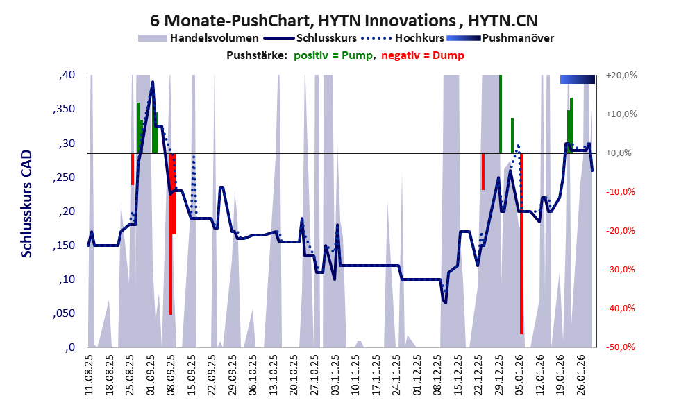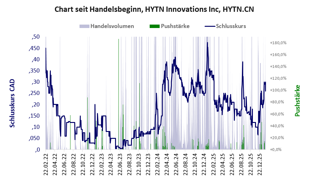 Ein Winzling und eine wertlose Firma, deren Aktie dem Kurspushing dient. HYTN verbrennt seit 2022 gut fünf Millionen CAD pro Jahr, hat kaum Umsatz und keinen Gewinn. Hauptaktivität scheinen die von Bullvestor begleiteten starken Pushmanöver zu sein, aus denen HYTN in kurzer Zeit eine Gewinnquote von 15 : 1 erzielt haben dürfte.