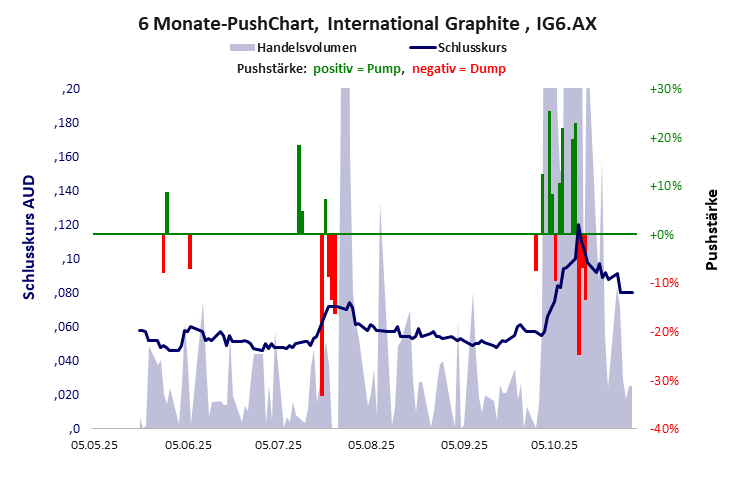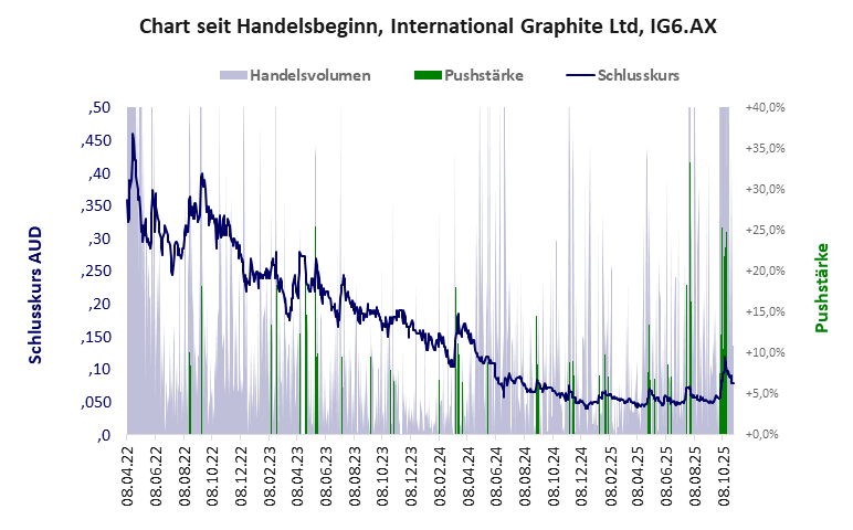 steter Kursverfall einer im Frühjahr 2024 gepushten Aktie eines wertlosen Unternehmens International Graphite hat ein schwaches Gesamtscoring und ist ein mickriger Pennystock mit einem riesigen Kursverlust. Das Gesamtvermögen ist überschaubar, die Vermögenswerte scheinen sehr werthaltig zu sein, der Umsatz ist mickrig, die Ertragslage extrem verlustreich, die Geldverbrennung ziemlich hoch.