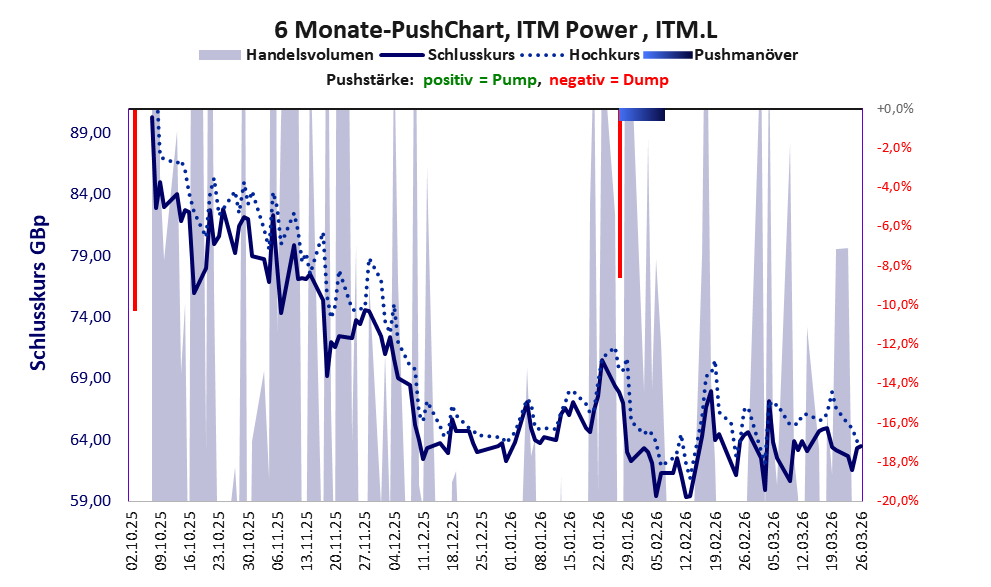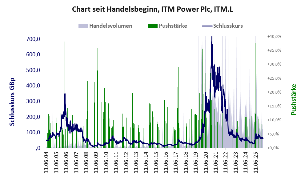 ITM Power machte 2025 Schlagzeilen mit zwei Abkommen, die dem Kurs wie üblich sofort Auftrieb gaben, aber vorsichtig betrachtet, noch keinen echten Substanzwert haben. In dem einen Fall „kann sich ITM Power berechtigte Hoffnung auf Aufträge aus Australien machen und das Projekt unterliegt noch einer finalen Investmententscheidung, die für das kommende Jahr erwartet wird“ und in dem anderen Fall „konnte ITM Power einen weiteren Auftrag vermelden. In Spanien hat sich ein führender Zementhersteller für das völlig autonome Elektrolyseursystem mit zwei Megawatt entschieden. Finanzielle Details nannten die Briten indes nicht“ (Der Aktionär). Die Auswertung der Kursdaten belegt, dass der Aktienkurs im Juni 2025 gepusht wurde und seitdem zwischen 56 und fast 100 GBp schwankt. Aufschwung gab es keinen. Und zum Zustand der Wasserstoffbranche gilt immer noch die wenig Chancen aufzeigende Recherche zu „Wasserstoff-Aktien kaufen?“