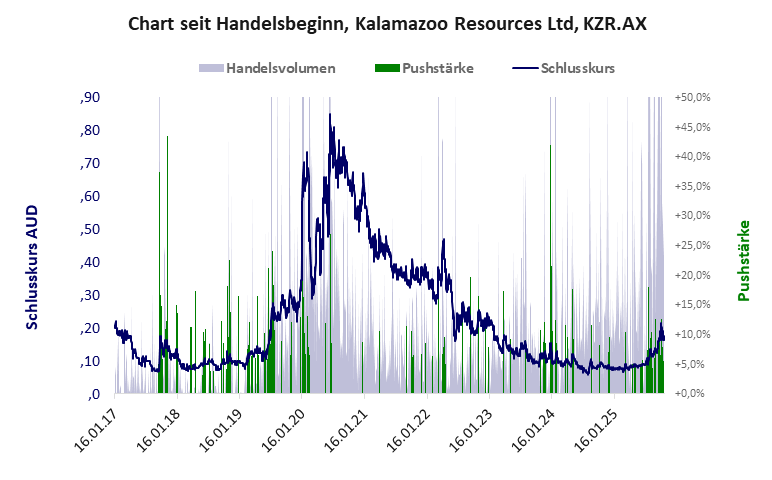 Die Pushstärke ist ein Maß, wie stark der Handelskurs der jüngsten Zeit vom Durchschnitt der Vergangenheit abweicht, und belegt somit Pushaktivitäten