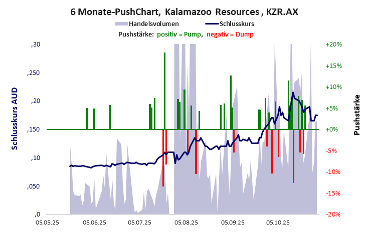 Kalamazoo hat keinen Substanzwert, der Kurs wurde gepusht, ist aber auf Sinkflug und nur noch für den Müll. Kalamazoo Resources hat ein akzeptables Gesamtscoring und ist ein mickriger Pennystock mit einem starken Kursverlust. Das Gesamtvermögen ist überschaubar, die Vermögenswerte scheinen sehr werthaltig zu sein, der Umsatz ist mickrig, die Ertragslage extrem verlustreich, die Geldverbrennung gering.