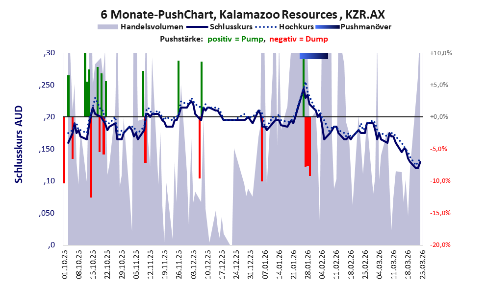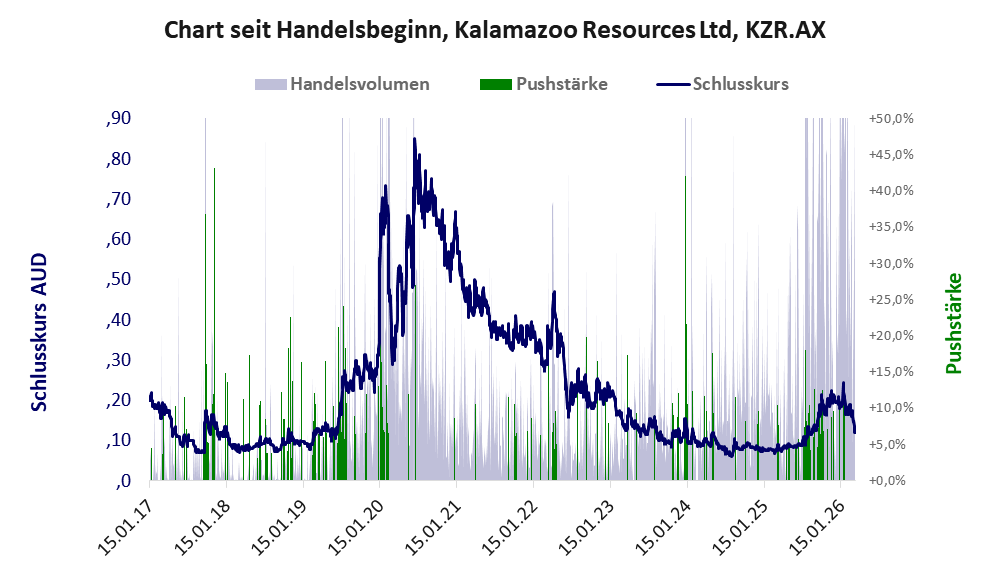 Über diese Aktie berichtet axino. Das tägliche Handelsvolumen betrug an obiger Börse während der letzten drei Monate bis Berichtsdatum: 1.048.306 Stück, das sind 0,3% der ausgegebenen Aktien. Bei Kalamazoo Resources fehlt ein operatives Geschäft, stattdessen wird das Geld der Investoren verbrannt.