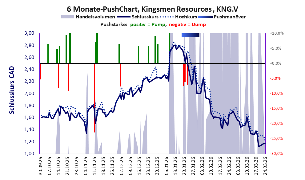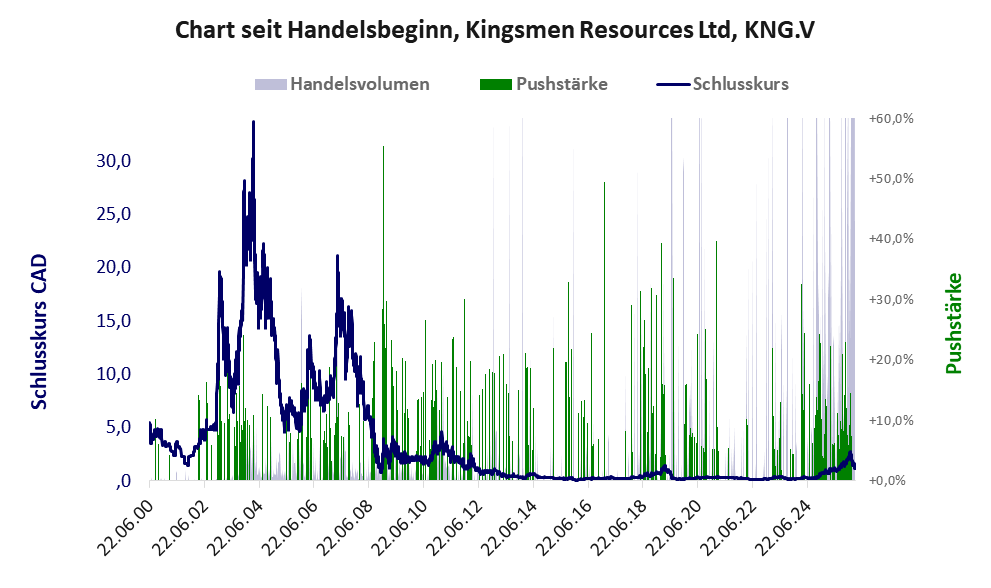 Das tägliche Handelsvolumen betrug an obiger Börse während der letzten drei Monate bis Berichtsdatum: 130.191 Stück, das sind 0,5% der ausgegebenen Aktien. Da Kingsmen Resources kaum Vermögen besitzt und unprofitabel ist, hat der Aktienkurs keinen Wert. Die Aktie dient in erster Linie Pushmanövern.