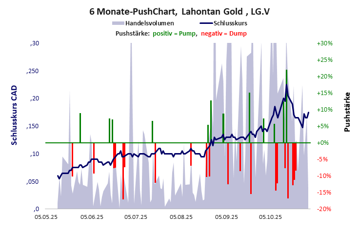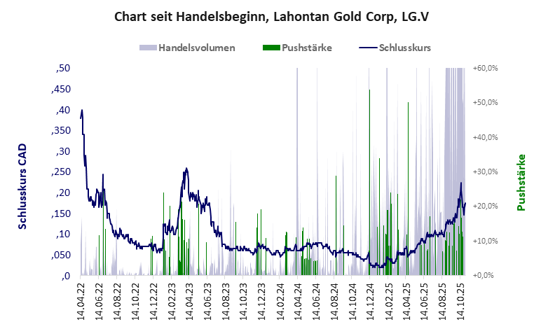Lahontan Gold hat ein schwaches Gesamtscoring und ist ein mickriger Pennystock mit einem starken Kursverlust. Das Gesamtvermögen ist überschaubar, die Vermögenswerte scheinen nicht werthaltig zu sein, der Umsatz ist nicht existent, die Ertragslage extrem verlustreich, die Geldverbrennung sehr hoch.