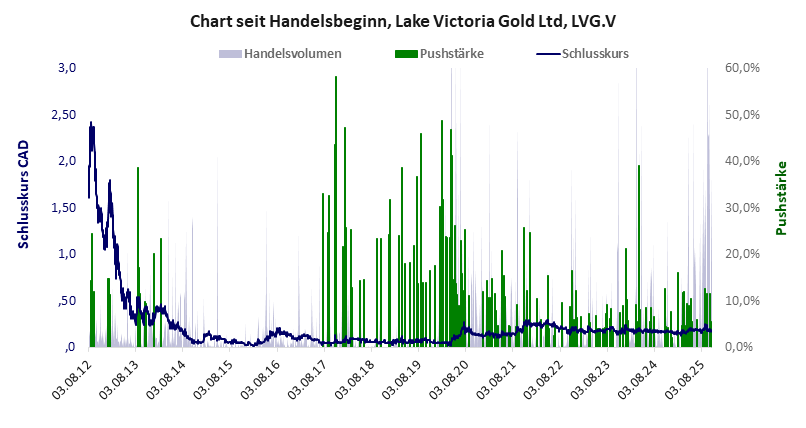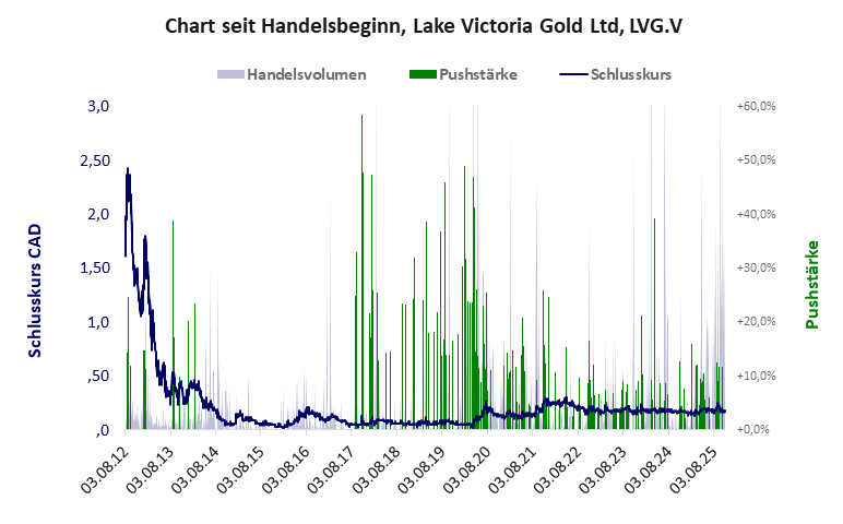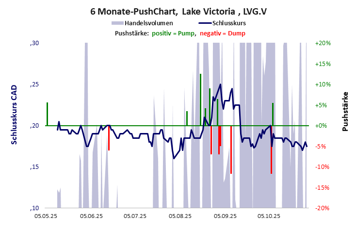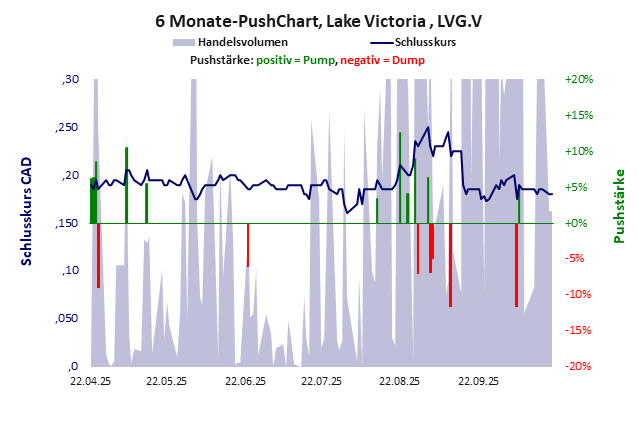 Lake Victoria hat ein kritisches Gesamtscoring und ist ein mickriger Pennystock mit einem riesigen Kursverlust. Das Gesamtvermögen ist überschaubar, die Vermögenswerte scheinen nicht werthaltig zu sein, der Umsatz ist nicht existent, die Ertragslage extrem verlustreich, die Geldverbrennung extrem hoch.