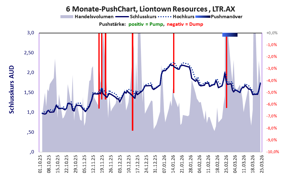 Über diese Aktie berichtet w:o. Das tägliche Handelsvolumen betrug an obiger Börse während der letzten drei Monate bis Berichtsdatum: 26.627.296 Stück, das sind 0,8% der ausgegebenen Aktien. Die hohe Geldverbrennung in der Explorationsphase von Liontown Resources hat sich gelohnt. Die Produktion wurde aufgenommen, ist aber noch unprofitabel.