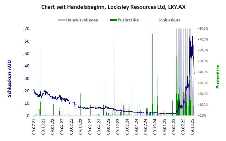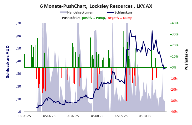 Die Aktie hat kein operatives Fundament und dient den Akteuren offenbar nur zum Pumpmanöver. Seit Mitte April 2025 wurde der Kurs massiv hochgetrieben, begleitet von einigen Gewinnmitnahmen. Das endgültige Inkassomanöver steht noch bevor. Nach Lage der Dinge handelt es sich um einen klassisches Pump and Dump. Interessant sind an diesem Fall zwei Nebenaspekte. Die Akteure sind im Gegensatz zu den meisten Fällen eine kleine unbekannte Mannschaft ohne Netzwerk. Zum anderen pusht ein User „Montekaolino“ im w:o-Forum die Aktie unentwegt und wie man sieht mit vollem Erfolg! Locksley Resources hat ein mäßiges Gesamtscoring und ist ein kleiner Pennystock mit Kursgewinn. Das Gesamtvermögen ist überschaubar, die Vermögenswerte scheinen sehr werthaltig zu sein, der Umsatz ist mickrig, die Ertragslage extrem verlustreich, die Geldverbrennung ziemlich hoch.