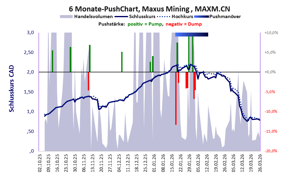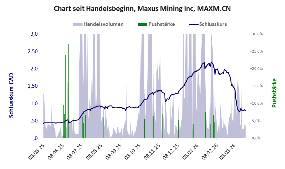 Das tägliche Handelsvolumen betrug an obiger Börse während der letzten drei Monate bis Berichtsdatum: 176.719 Stück, das sind 0,5% der ausgegebenen Aktien. Da Maxus Mining kaum Vermögen besitzt und unprofitabel ist, hat der Aktienkurs keinen Wert. Die Aktie dient in erster Linie Pushmanövern.
