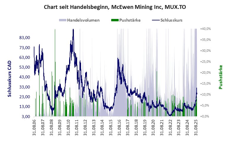 produzierende Mine mit gepushtem Aktienkurs. McEwen Mining hat ein schwaches Gesamtscoring und ist eine teure Aktie mit einem riesigen Kursverlust. Das Gesamtvermögen ist groß, die Vermögenswerte scheinen noch werthaltig zu sein, der Umsatz ist sehr groß, die Ertragslage schlecht, die Geldverbrennung sehr hoch.