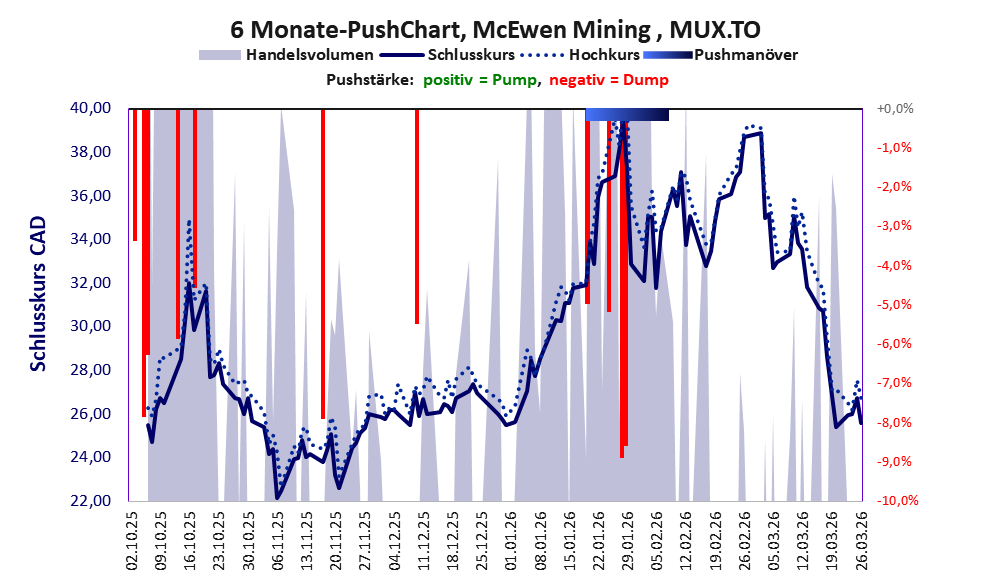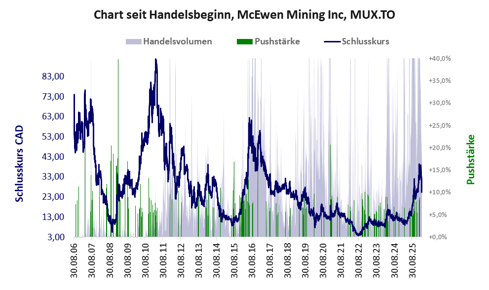 Über diese Aktie berichtet SRC. Das tägliche Handelsvolumen betrug an obiger Börse während der letzten drei Monate bis Berichtsdatum: 79.906 Stück, das sind 0,1% der ausgegebenen Aktien. Die hohe Geldverbrennung in der Explorationsphase von McEwen Mining hat sich gelohnt. Die Produktion wurde aufgenommen, ist aber kaum profitabel.