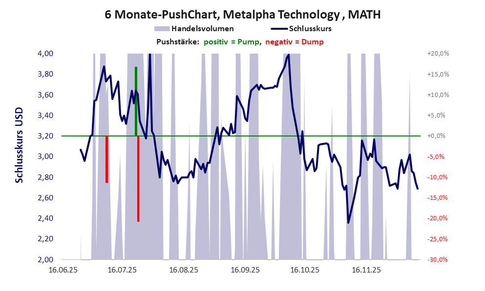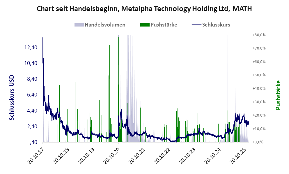 Netzwerk: Metalpha startete mit einem offensichtlich überzogenen Aktienkurs, der innerhalb von 14 Tagen um 50% einbrach. Die weitere Kursentwicklung ist geprägt von laufenden Pushmanövern. Seit 2025 wird der Kurs wieder angetrieben und stieg um runde 150%. Wie wird es an der FWB weiter gehen?