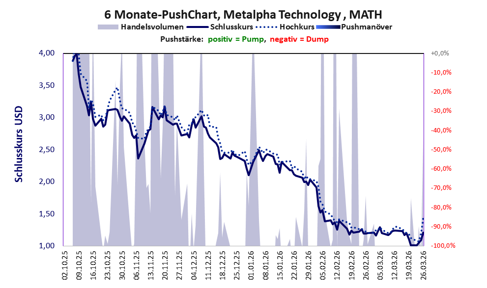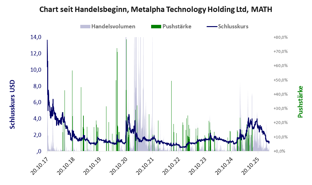 Bei dieser Aktie gibt es 1 Pump & Dump-Manöver. Das tägliche Handelsvolumen betrug an obiger Börse während der letzten drei Monate bis Berichtsdatum: 59.129 Stück, das sind 0,1% der ausgegebenen Aktien. Bei Metalpha Technology rechtfertigt das schwache operative Geschäft nicht die Geldverbrennung.
